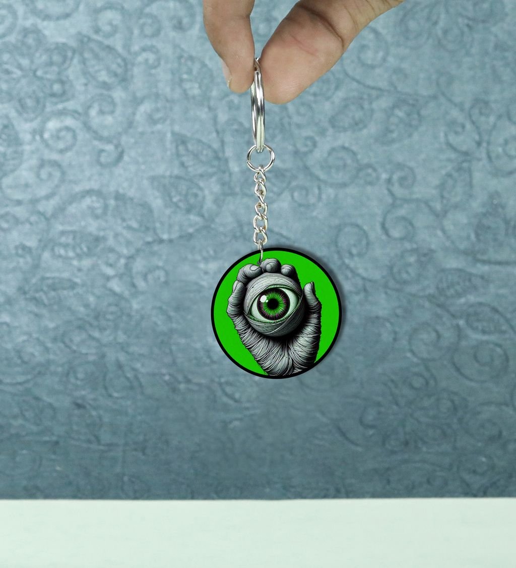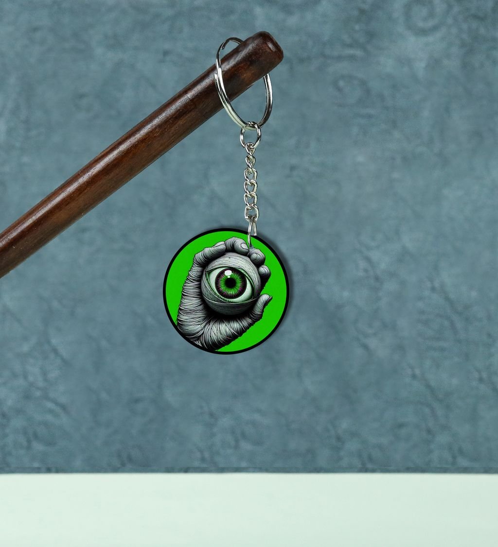 Alien Eyeball Held By Creepy Wrapped Hand Printed Round Keychain Pack of 2