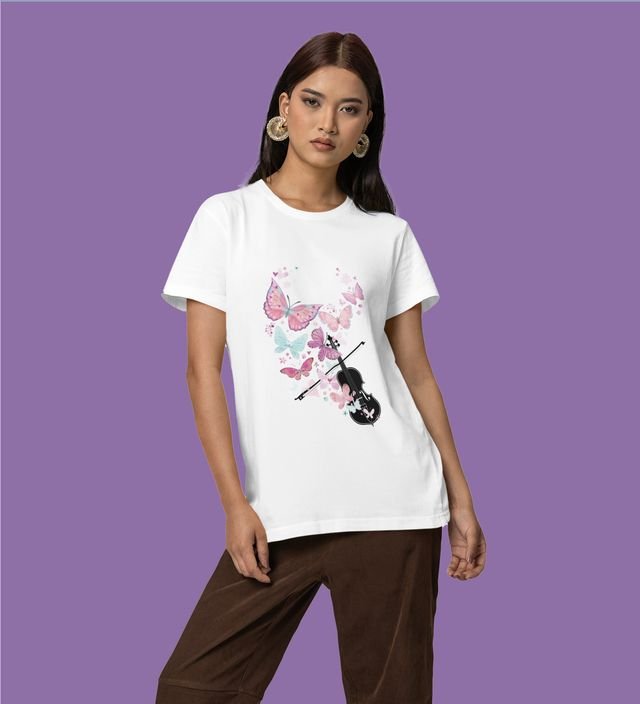 Wings of Melody: Elegant Violin and Butterflies Graphic Printed Black T-Shirt